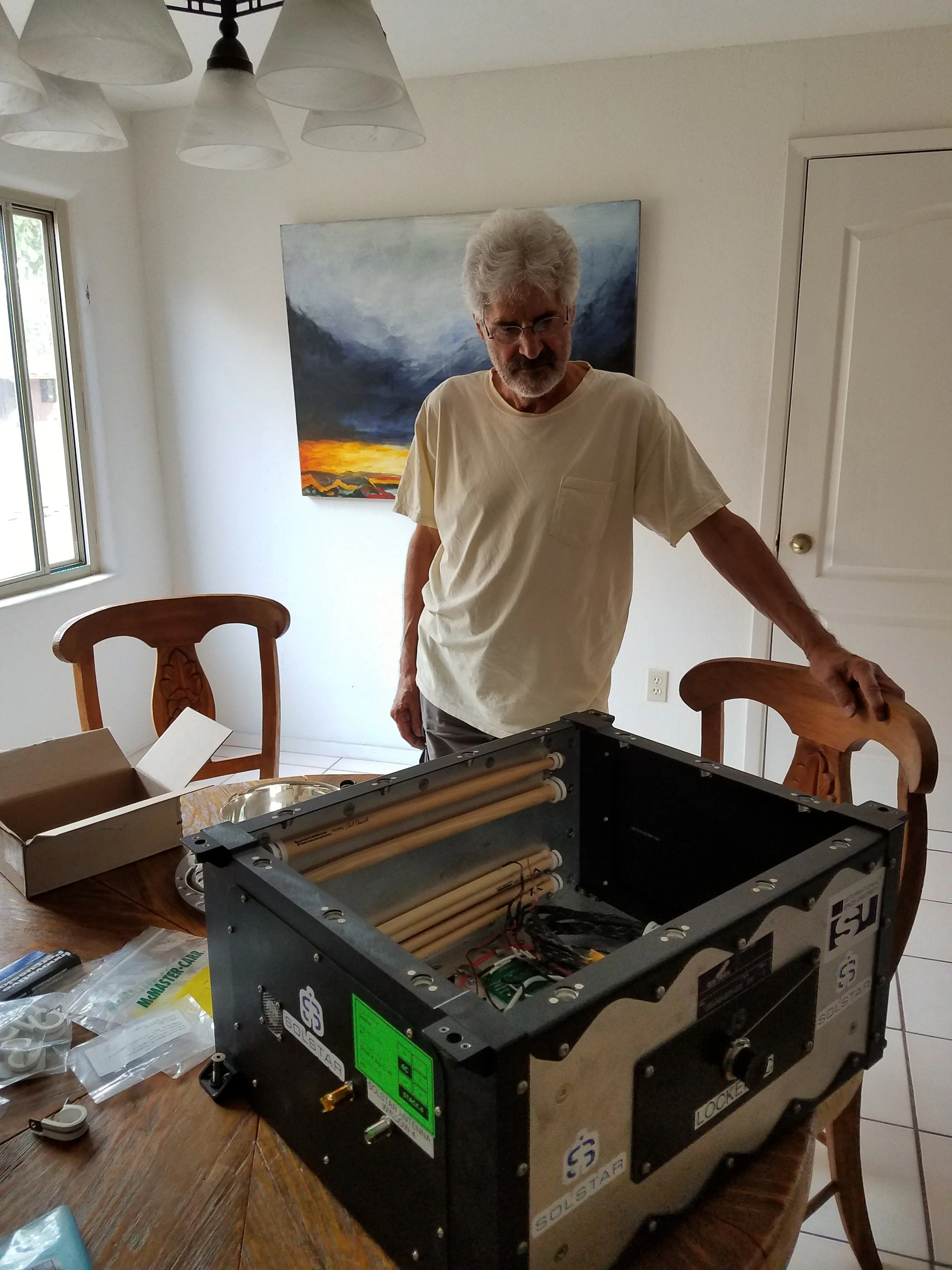 Brian’s friend and fellow musician, Michael Collamati, preparing drumsticks for flight to space, June 2018